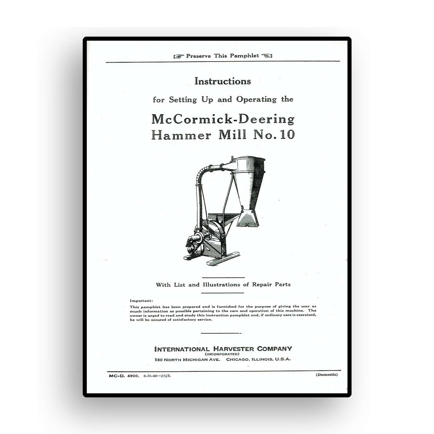 Instructions for McCormick-Deering No. 10 Hammer Mill with Parts List
