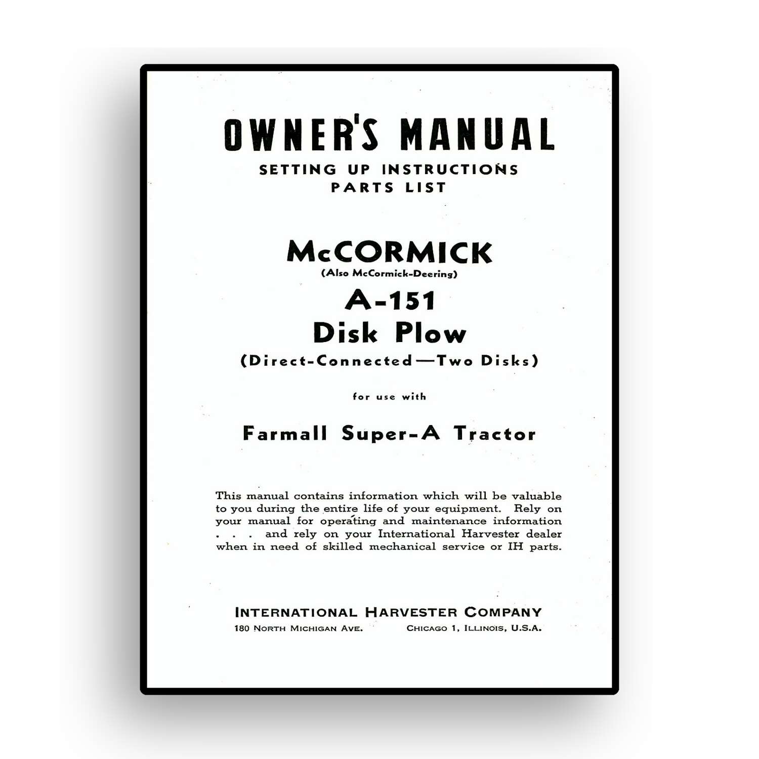 Owners Manual for McCormick A-151 Two-Disk Plow for Super A