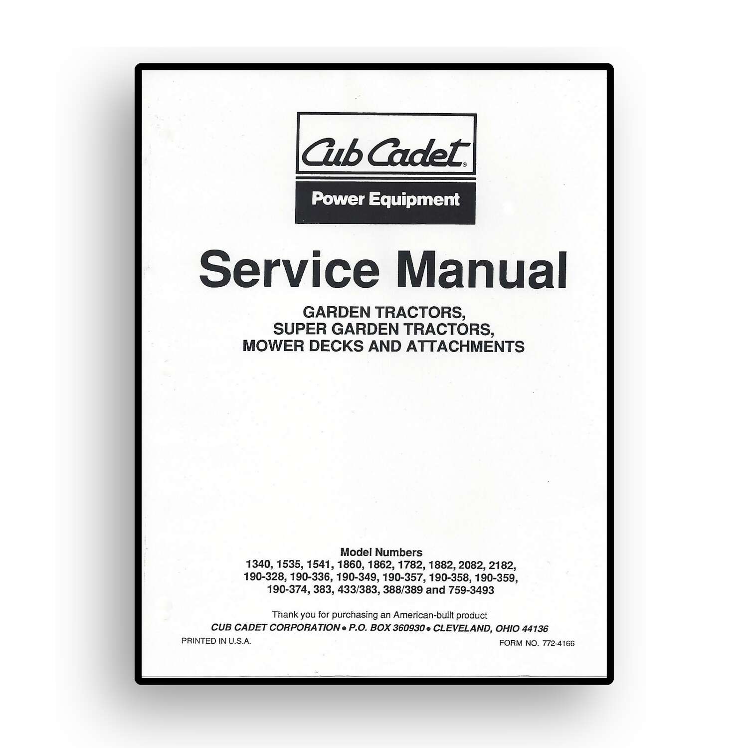 Service Manual for 1990-1992 Cub Cadet Garden Tractor, Super Garden Tractor, Mower Decks & Attach.